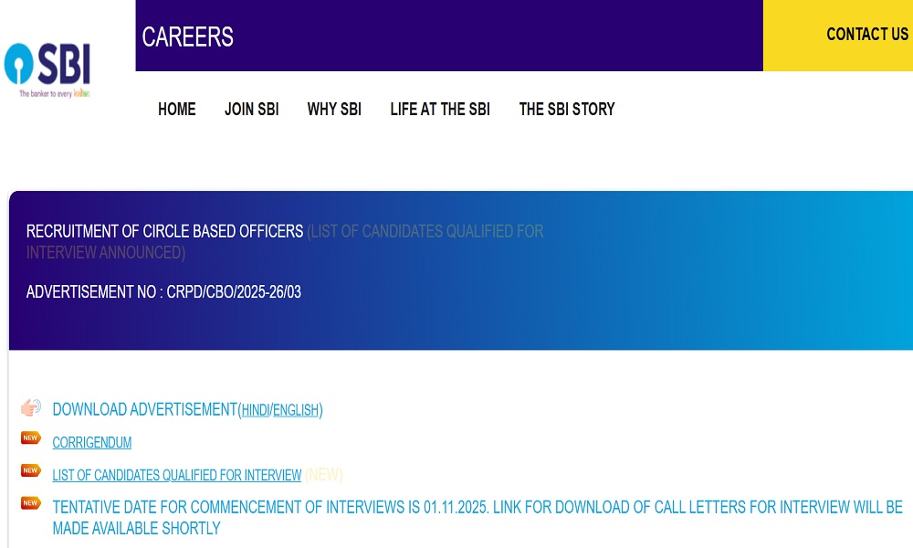 - एसबीआई सीबीओ (CRPD/CBO/2025-26/03) रिजल्ट चेक करने के लिए सबसे पहले आधिकारिक वेबसाइट sbi.co.in पर विजिट करें।