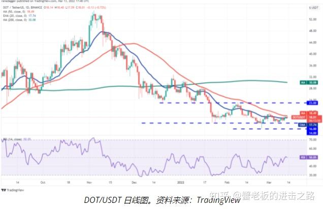 Polkadot ( DOT ) 在过去几个月一直处于下降趋势,但多头正试图在 16 美元至 14 美元之间的区域内形成底部。价格升至 20 日均线(17 美元)上方,但多头未能克服 50 日均线(18 美元)的关口。