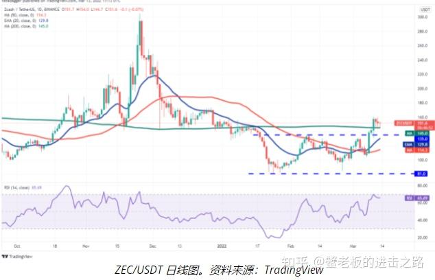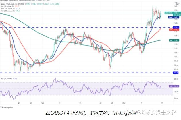 空头目前正试图将价格拉回 200 日均线下方并挑战 135 美元的突破水平。这是多头捍卫的重要水平,因为跌破该水平可能表明最近的突破可能是熊市陷阱。ZEC/USDT 对可能会跌至 50 日均线(114 美元)。