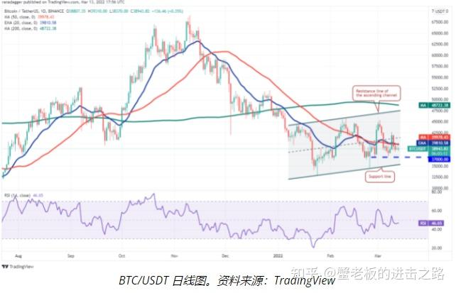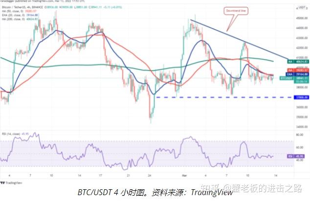 比特币在 3 月 12 日和周日形成十字星烛台形态,表明多头和空头之间犹豫不决。价格停留在 20 天指数移动平均线(39,810 美元)和水平支撑位 37,000 美元之间。