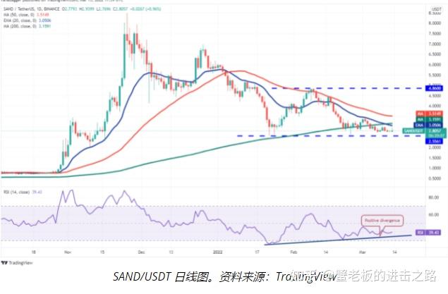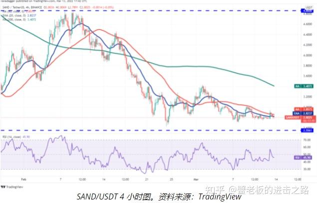 过去几周,沙盒 (SAND) 一直在 2.55 美元至 4.86 美元之间波动。空头在 3 月 4 日将价格拉低至 200 日均线(3.15 美元)下方,但未能突破 2.55 美元的支撑位。