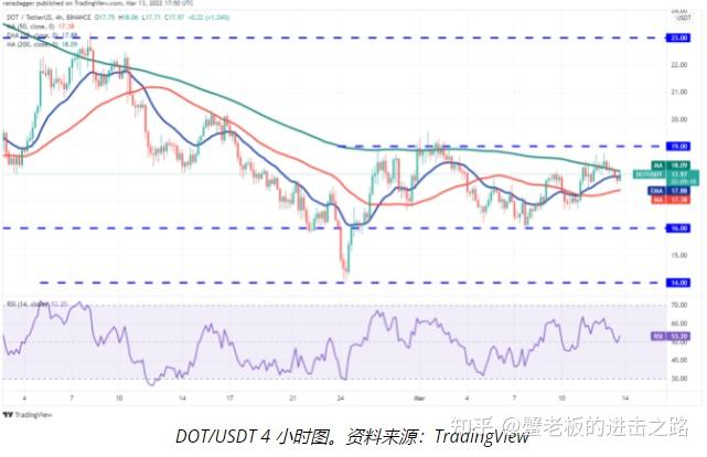 然而,一个积极的迹象是,多头并未放弃 50 天 SMA 的太多空间。这表明交易者可能会坚守自己的头寸,预计会突破阻力位。如果发生这种情况,DOT / USDT 对可能反弹至上方阻力位 23 美元,空头可能再次构成严峻挑战。