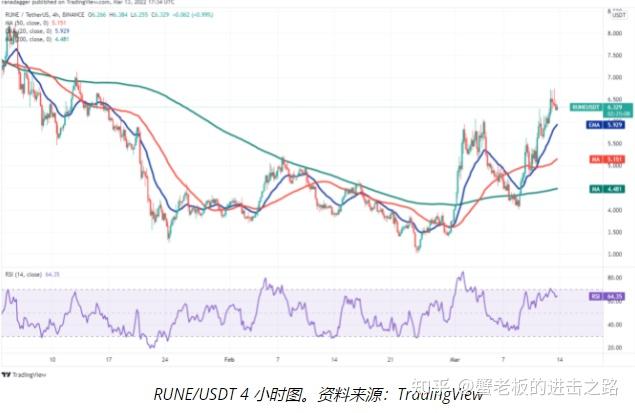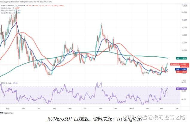 多头现在将试图将价格推高至 200 日均线(7.90 美元),空头可能再次构成强劲挑战。如果价格没有从 200 日均线回落太多,多头将再次尝试清除这一障碍。如果他们成功,RUNE/USDT 对可能升至 9 美元。