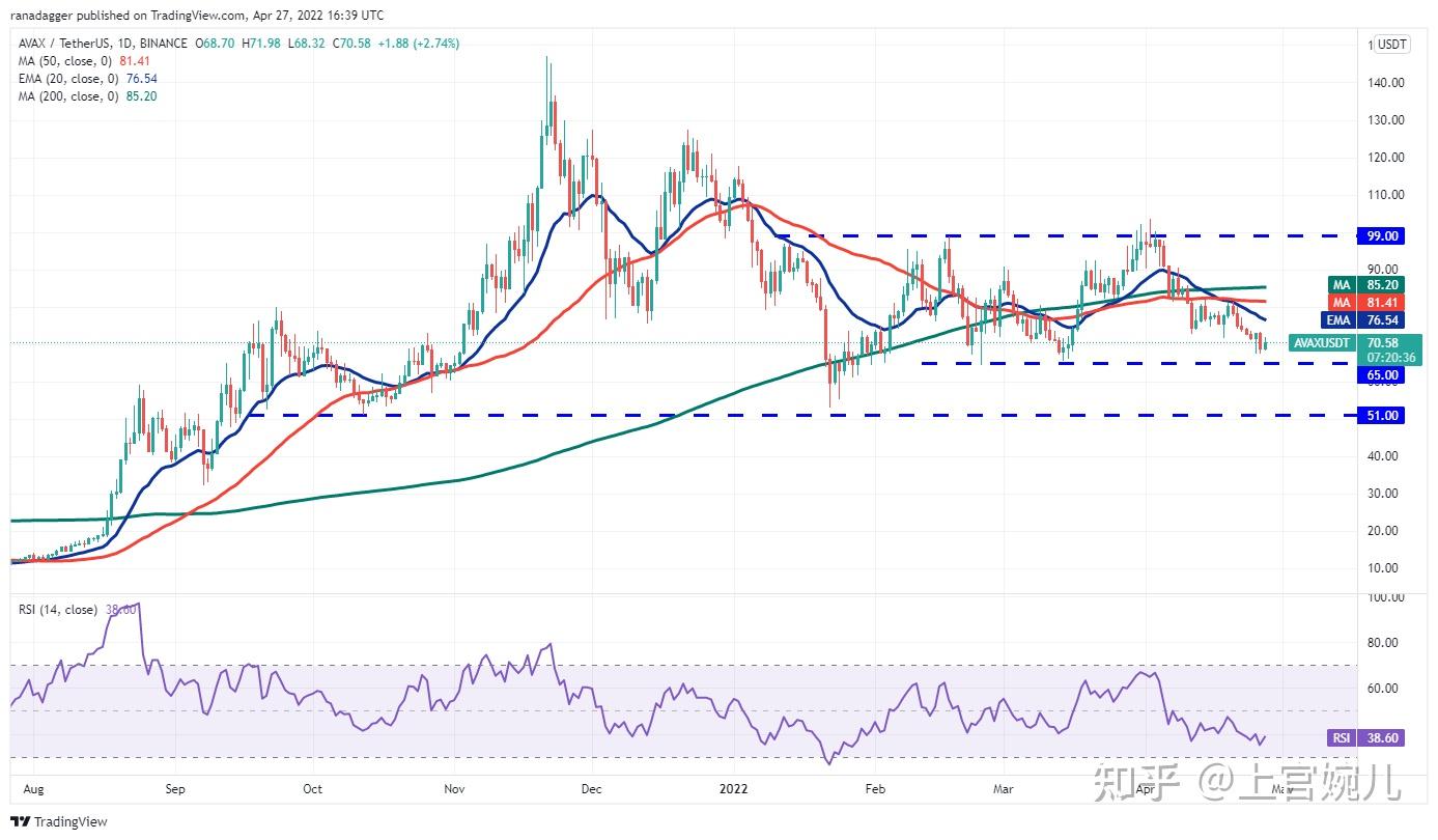 在过去的几天里, Terra 的LUNA代币一直在 20 天均线(91 美元)上下波动。买家在 4 月 25 日将价格推高至 50 日均线(94 美元)上方,但无法维持较高水平。