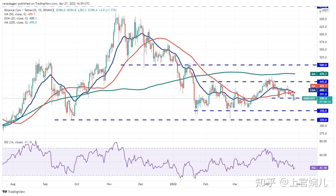 如果他们成功,价格可能会上涨至 20 天均线(408 美元)。这是一个需要密切关注的重要阻力,因为如果多头清除这一障碍,BNB/USDT 货币对可能升至 431 美元,然后尝试反弹至 460 美元。