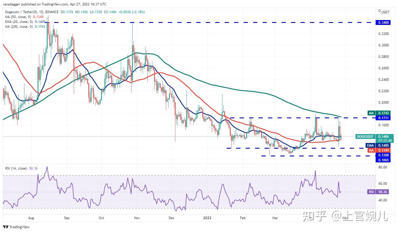 狗狗币 ( DOGE ) 在 4 月 25 日飙升至上方阻力位 0.17 美元,但多头无法克服这一障碍。未能做到这一点可能会吸引短期交易者获利了结,这使价格在 4 月 26 日回落至 20 日均线(0.14 美元)下方。
