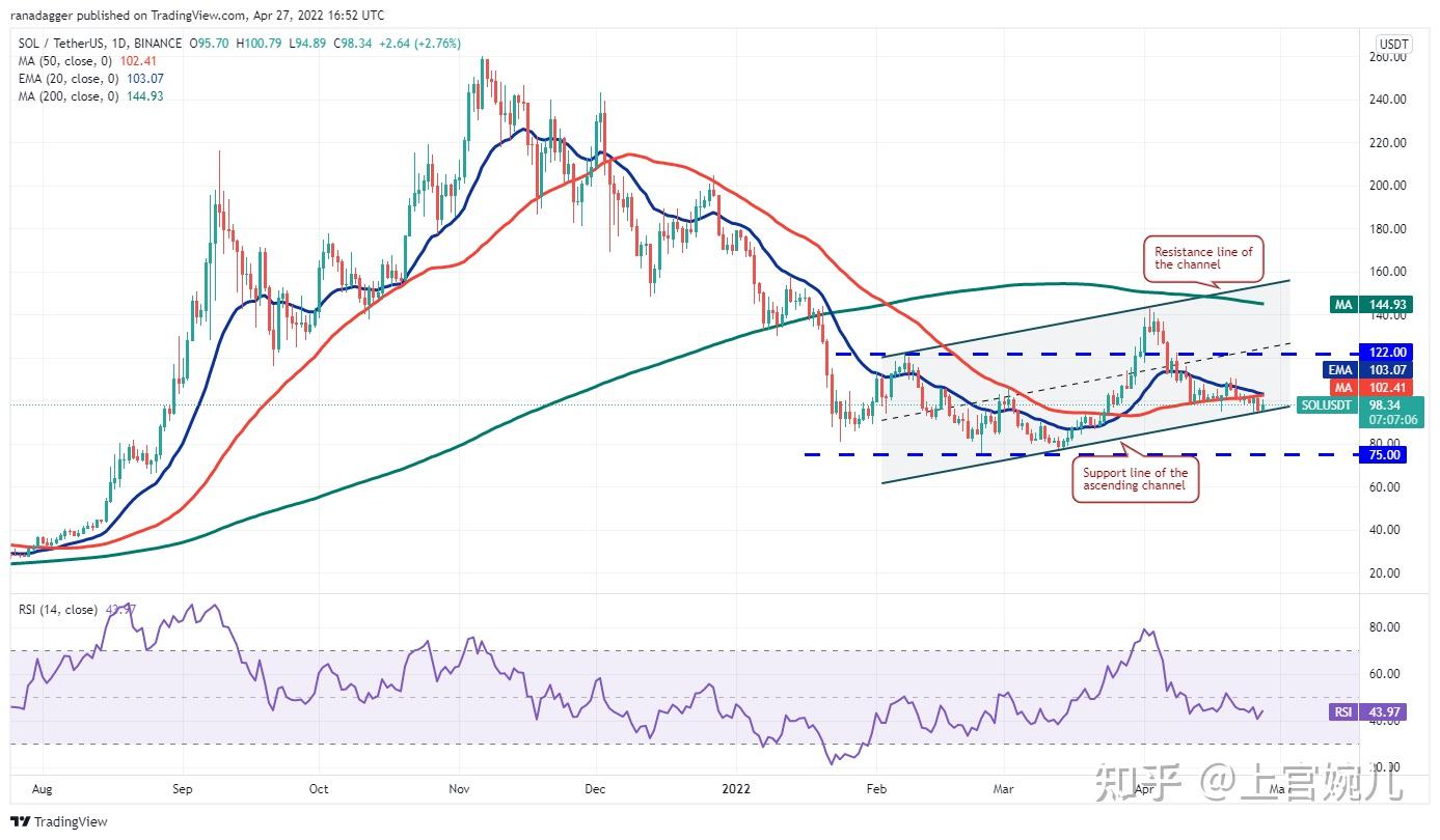 向下倾斜的 20 天 EMA 和低于 44 的 RSI 表明对卖家有利。如果价格从当前水平或 20 天均线回落,将增加跌破上升通道的可能性。如果发生这种情况,SOL/USDT 可能会跌至 75 美元的强劲支撑位。