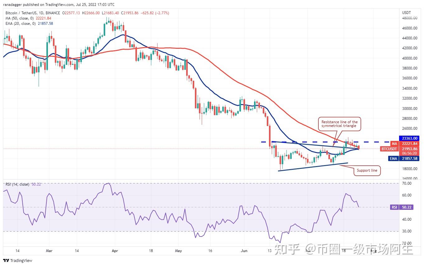 比特币/USDT比特币在 7 月 23 日从 20 天指数移动平均线(EMA)(21,857 美元)反弹,但多头未能在 7 月 24 日突破 23,363 美元的障碍。这表明空头正在积极捍卫上方阻力位。