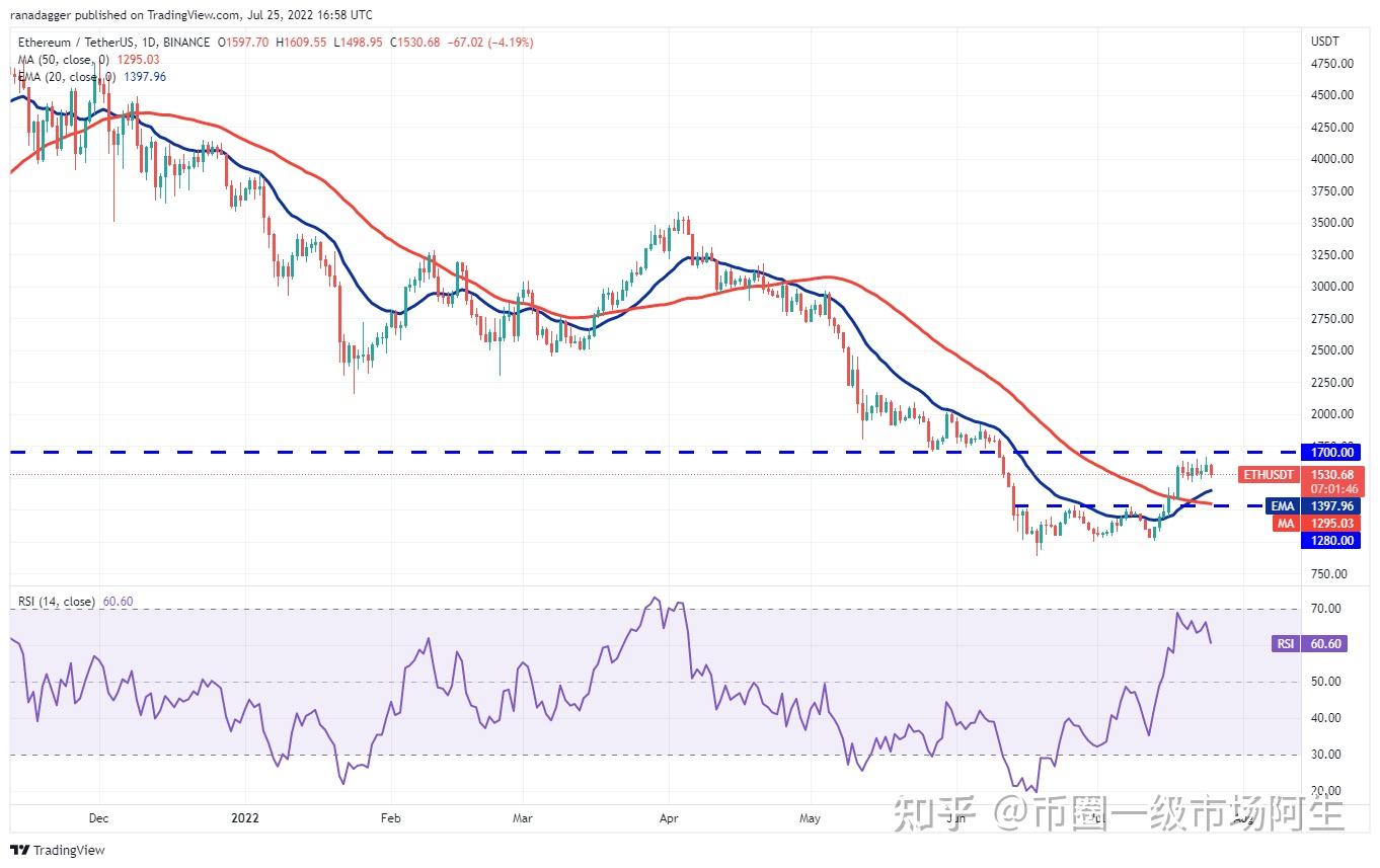 价格已回到 20 天均线,这是一个值得关注的重要水平。如果这个水平破裂,BTC/USDT 对可能跌至 20,750 美元。这样的举动将使对称三角形的突破无效。20 日均线趋于平缓,相对强弱指数 (RSI) 已跌至中点,表明供需平衡。如果价格突破 23,363 美元,这一优势可能有利于买家。如果发生这种情况,该货币对可能反弹至 28,171 美元,然后升至 30,000 美元。空头必须将价格跌至支撑线下方才能占据上风。以太币/USDT过去几天,空头成功捍卫了上方阻力位 1,700 美元。然而,一个较小的积极因素是多头不允许以太 ( ETH ) 跌破 1,464 美元,表明买盘处于较低水平。