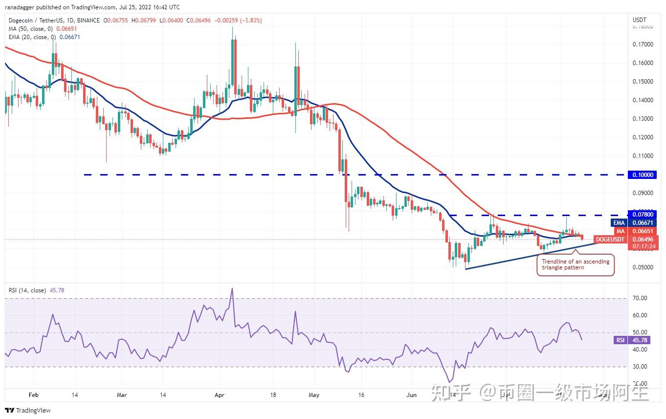 如果价格从支撑线反弹,买家将再次尝试将 SOL/USDT 货币对推向上方阻力位 48 美元。多头将不得不清除这一障碍,以表明上升三角形模式的完成。这种看涨设置的目标是 71 美元。相反,如果空头将价格跌破支撑线,则看涨格局将被否定。然后该货币对可能跌至 30 美元。跌破该水平将表明空头重新控制局面。狗狗币/USDT空头在 7 月 25 日将狗狗币 ( DOGE ) 拉至移动平均线下方,这为趋势线的下跌打开了大门。多头可能会积极捍卫这一水平。