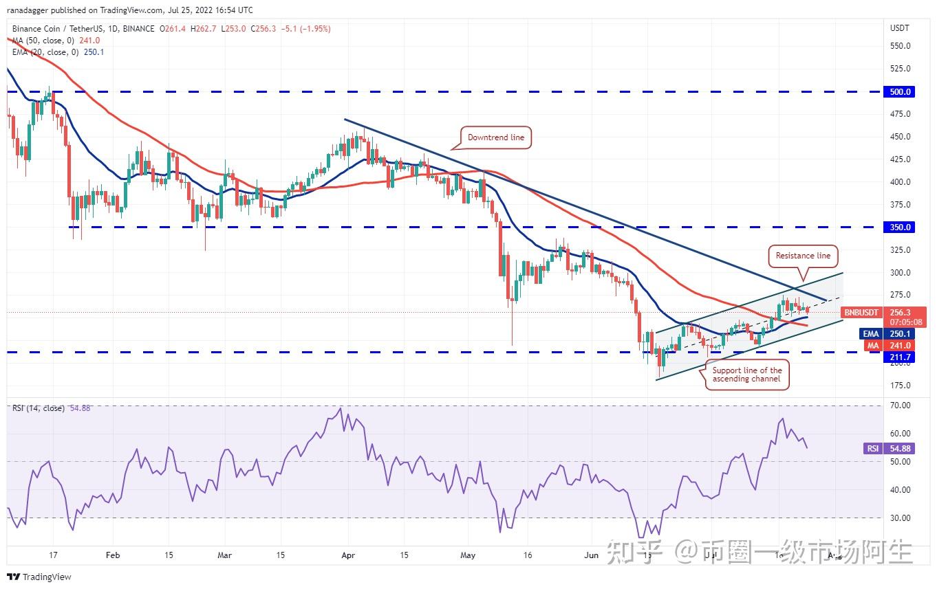 如果价格再次从 1,464 美元反弹,则 ETH/USDT 货币对可能会在几天内继续其窄幅区间波动。上涨的 20 日均线(1,397 美元)和 RSI 在正区域表明阻力最小的路径是上行。突破并收于 1,700 美元上方可能预示着上涨趋势的恢复。然后该货币对可能反弹至 2,000 美元。如果价格跌破 20 日均线,这种积极观点可能会失效。如果发生这种情况,该货币对可能会跌至 1,280 美元。从该水平强劲反弹可能会使该货币对在 1,280 美元至 1,700 美元之间波动几天。BNB/USDTBNB 从 7 月 23 日的下降趋势线回落,表明空头继续强势守住该水平。空头现在将试图将价格压低至移动平均线下方。