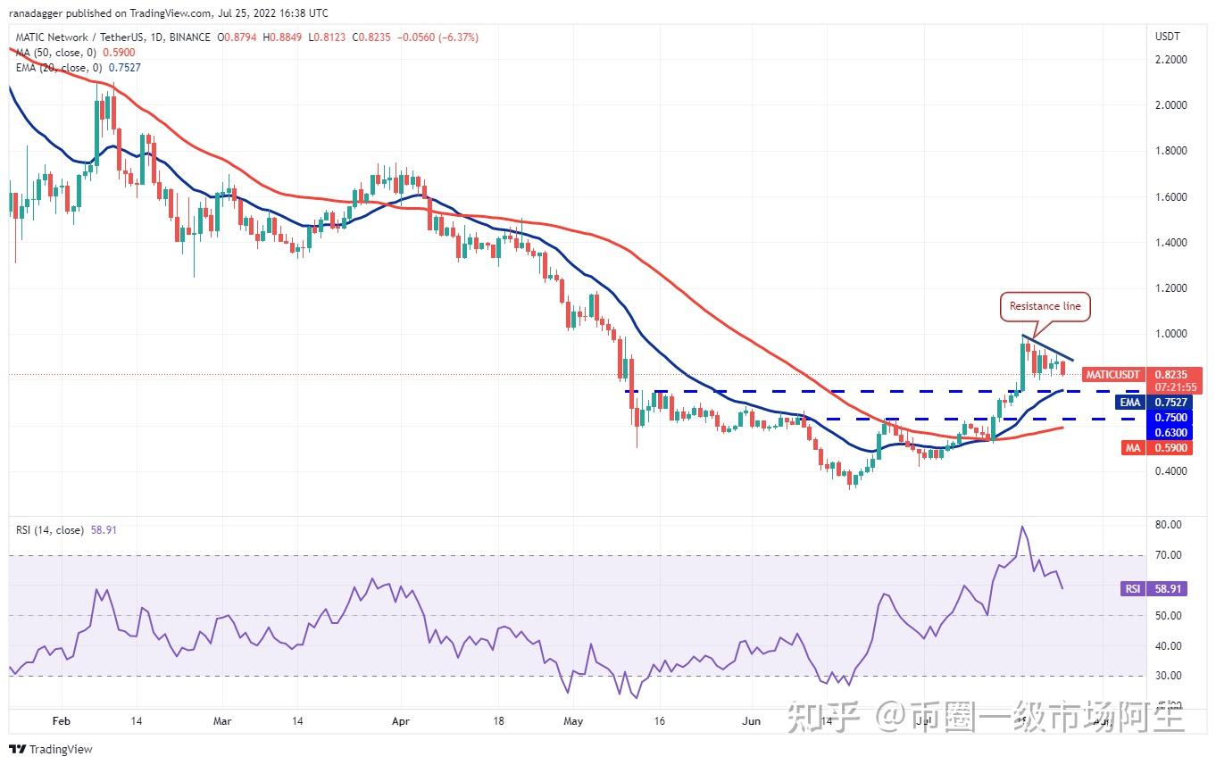 DOT/USDT 货币对在 7 月 25 日跌破 20 日均线(7.23 美元)。如果空头将价格维持在该水平下方,则该货币对可能滑向 6 美元的强劲支撑位。这是一个值得关注的重要水平,因为跌破并收于该水平下方可能预示着下跌趋势的恢复。另一种可能性是价格从当前水平回升并突破 50 日均线。如果发生这种情况,这将表明需求处于较低水平。然后该货币对可能升至 8.79 美元,随后升至 10 美元的心理水平。MATIC/USDTPolygon ( MATIC ) 从 7 月 25 日的阻力线回落,表明空头正在小幅反弹中抛售。空头将试图将价格跌至下一个支撑位 0.75 美元。