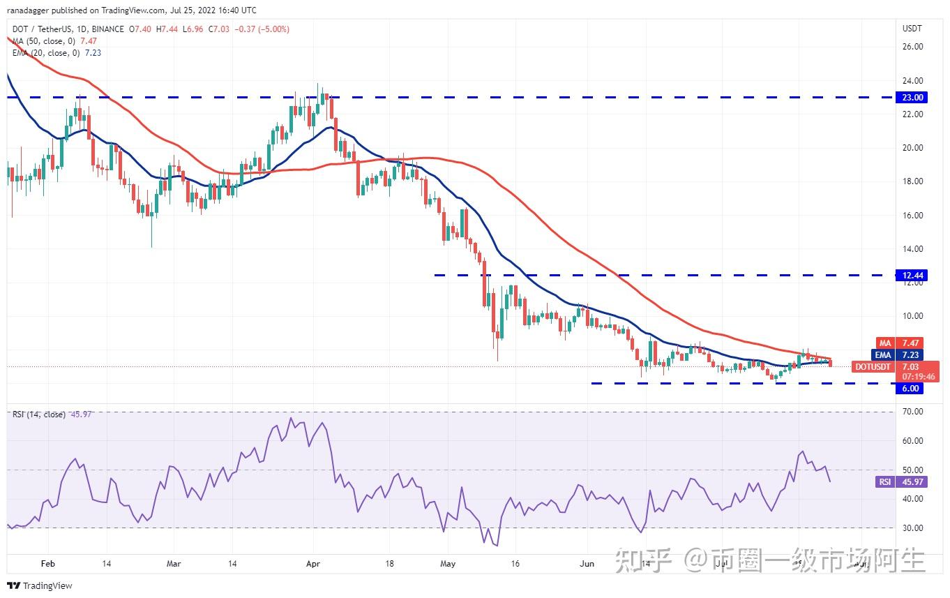 如果价格从趋势线反弹,多头将试图将 DOGE/USDT 货币对推高至移动平均线上方。如果发生这种情况,该货币对可能会升至 0.08 美元的上方阻力位。突破并收于该水平上方将完成一个目标目标为 0.11 美元的上升三角形模式。相反,如果价格跌破趋势线,则看涨设置将被否定。这可能会使该货币对跌至 0.06 美元,然后跌至关键支撑位 0.05 美元。相关:以太坊的看跌掉头?在 1.6K 美元被拒绝后,ETH 价格势头减弱点/USDT过去几天,多头一再未能将 Polkadot ( DOT ) 推高至 50 天简单移动平均线 (SMA) (7.47 美元) 以上,表明空头正在积极捍卫该水平。