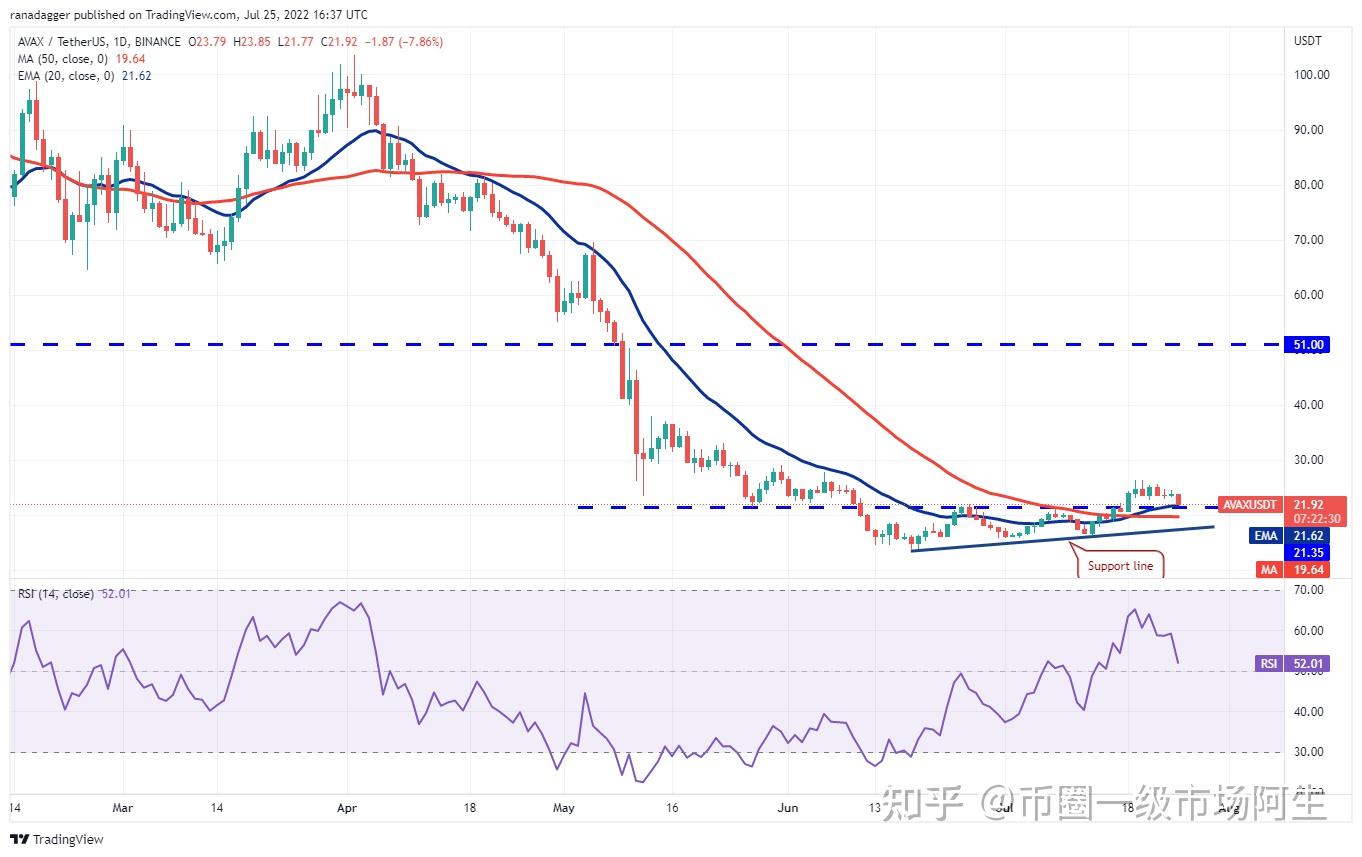 上涨的 20 日均线(0.75 美元)和 RSI 处于正值区域表明买家略有优势。如果价格从 0.75 美元反弹,多头将再次尝试将 MATIC/USDT 对推高至阻力线上方。如果成功,该货币对可能反弹至 1 美元的心理水平。多头必须清除这一障碍才能开始上涨至 1.26 美元。相反,如果价格跌破 0.75 美元,则表明看涨势头已经减弱。然后该货币对可能下滑至 0.63 美元。AVAX/USDT雪崩 ( AVAX ) 在 7 月 23 日形成十字星烛台形态,在 7 月 24 日形成日内烛台形态,表明多头和空头之间犹豫不决。