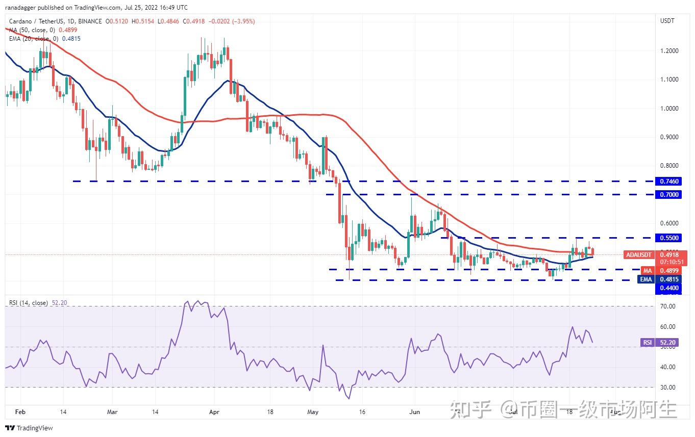 空头正试图将价格压低至移动平均线下方。如果他们设法做到这一点,XRP/USDT 对可能会逐渐下跌至 0.30 美元。买家可能会全力捍卫这一水平,因为如果支撑破裂,该货币对可能会恢复下行趋势。或者,如果价格从当前水平反弹,多头将再次尝试清除 0.39 美元的上方障碍并开始新的上涨。然后该货币对可能反弹至 0.50 美元。ADA/USDT卡尔达诺(ADA)试图在 7 月 24 日突破上方阻力位 0.55 美元,但空头成功守住了该水平。这可能已经吸引了短期交易者的获利了结。