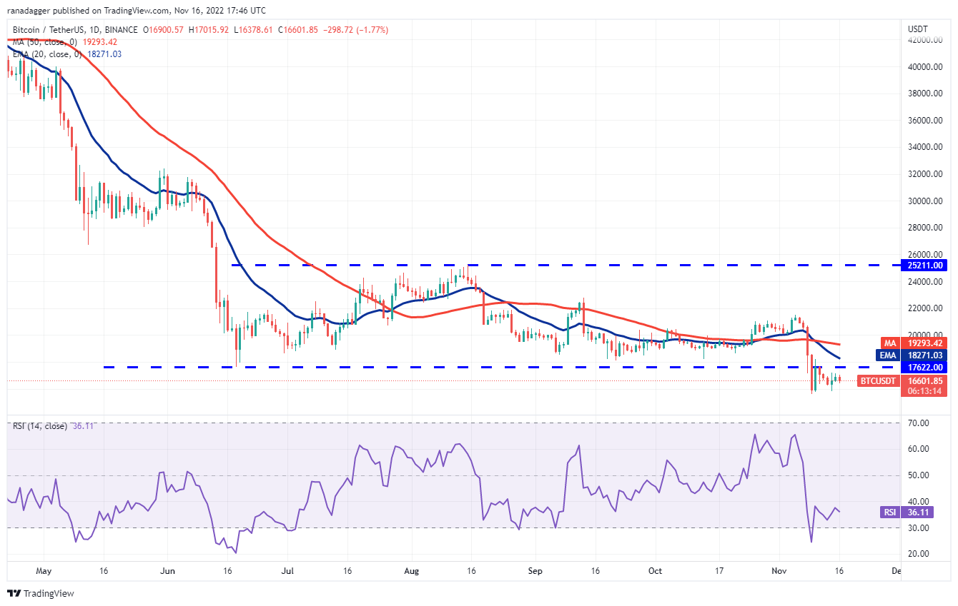 比特币在 11 月 9 日跌破并收于 6 月低点 17,622 美元下方。这标志着下跌趋势的恢复。尽管多头试图在 11 月 10 日上演强劲复苏,但他们的努力在 17,622 美元上方遭遇大量抛售。这表明空头已将该水平转为阻力位。