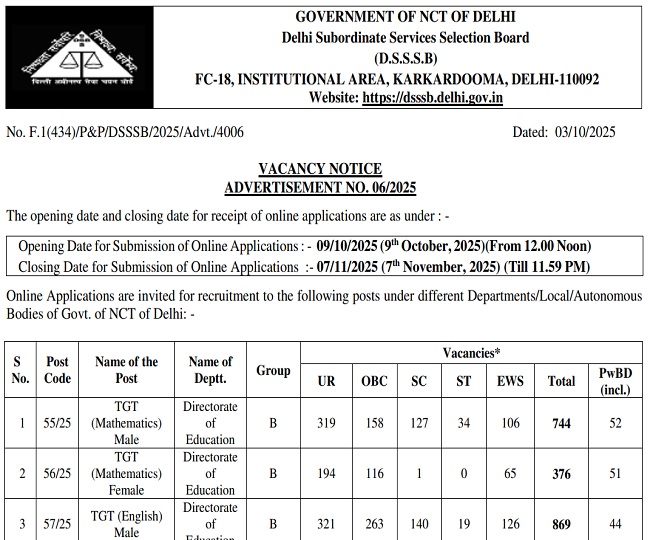 DSSSB TGT Recruitment 2025: आवेदन 9 अक्टूबर से होंगे स्टार्ट।