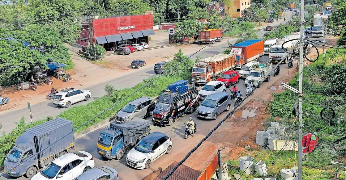 Murungoor traffic jam caused by a water pipe burst near an underpass construction site. The incident led to severe congestion on the National Highway, affecting commuters and emergency services. Road construction delays and inadequate planning contributed to the problem.