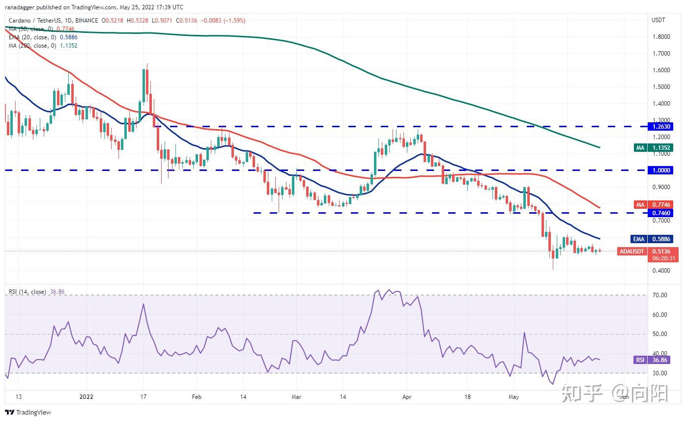 如果价格从 0.49 美元的支撑位反弹,则 ADA/USDT 货币对可能会在该范围内停留几天。多头将不得不将价格推高并维持在 20 天均线(0.58 美元)上方,以表明强劲的救济反弹开始,可能达到 0.74 美元的细分水平。