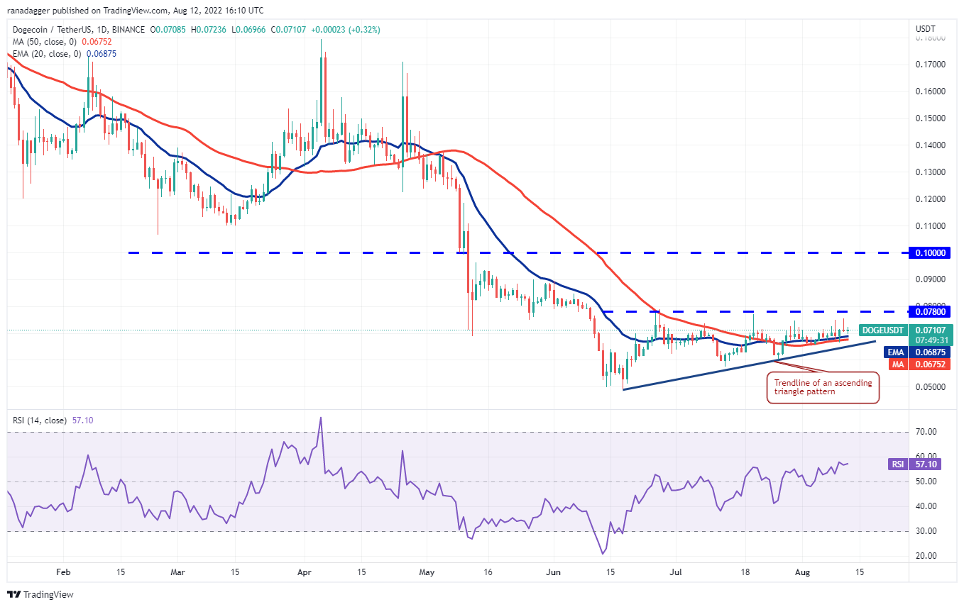 与此假设相反,如果价格从移动平均线反弹,则表明多头继续在较低水平买入。多头必须将价格推高至 0.08 美元以上才能完成上升三角形模式。如果发生这种情况,DOGE/USDT 对可能反弹至 0.10 美元。