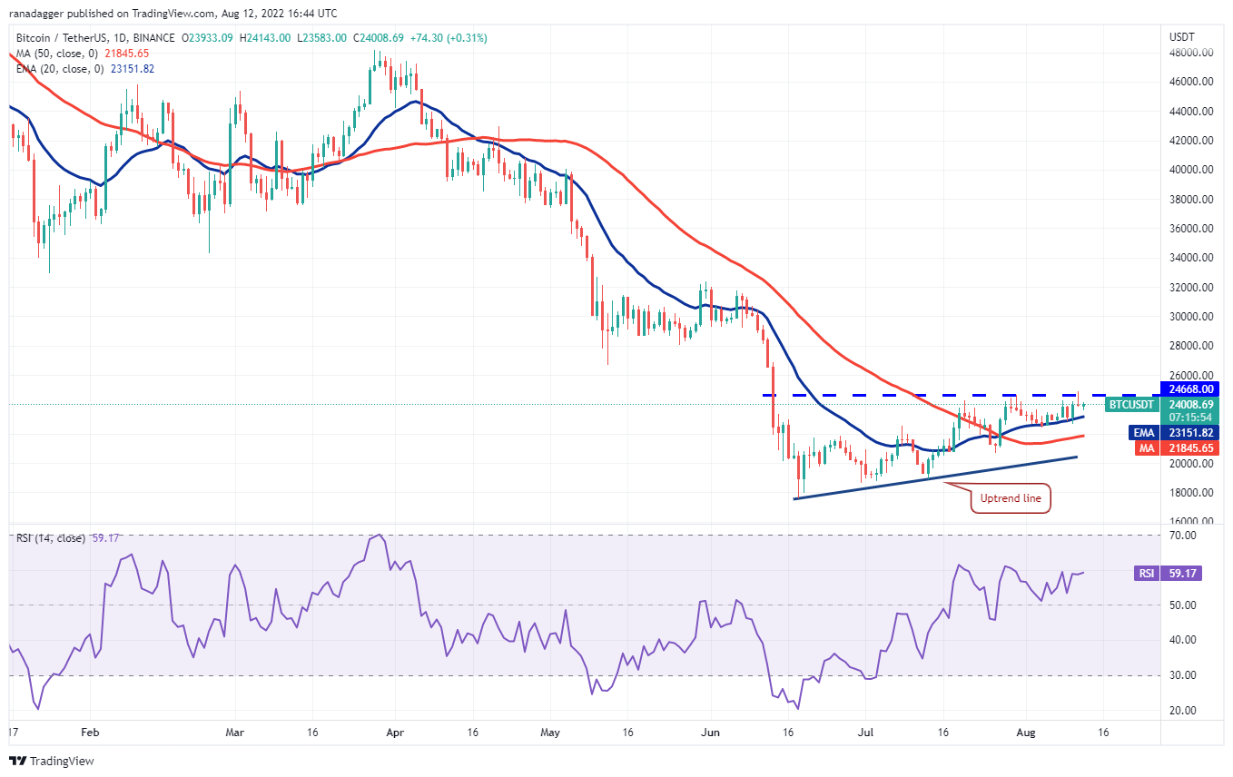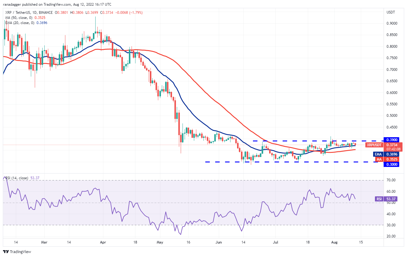 XRP仍停留在 0.39 美元的上方阻力位和 20 日均线(0.37 美元)之间。空头试图在 8 月 9 日和 8 月 10 日以有利于他们的方式解决这种不确定性,但多头买入下跌并将价格推回 20 天均线上方。