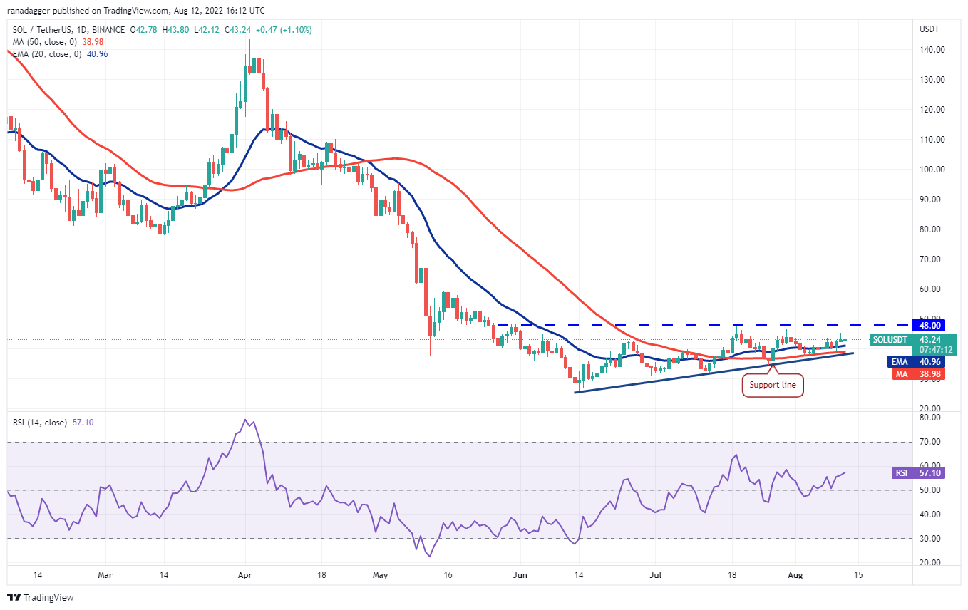 Solana ( SOL ) 于 8 月 10 日从 50 日均线 (39 美元) 反弹,表明多头继续在较低水平买入。多头试图将价格推高至 48 美元的上方阻力位,但空头在 8 月 11 日阻止了反弹至 45.32 美元。