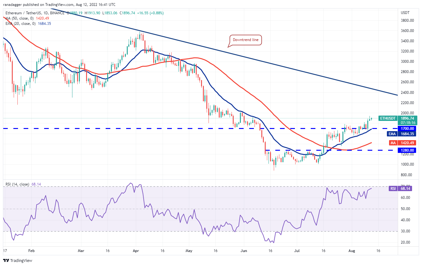 以太币试图在 8 月 11 日升至 2,000 美元以上,但当天烛台上的长灯芯表明空头正在大力捍卫这一水平。