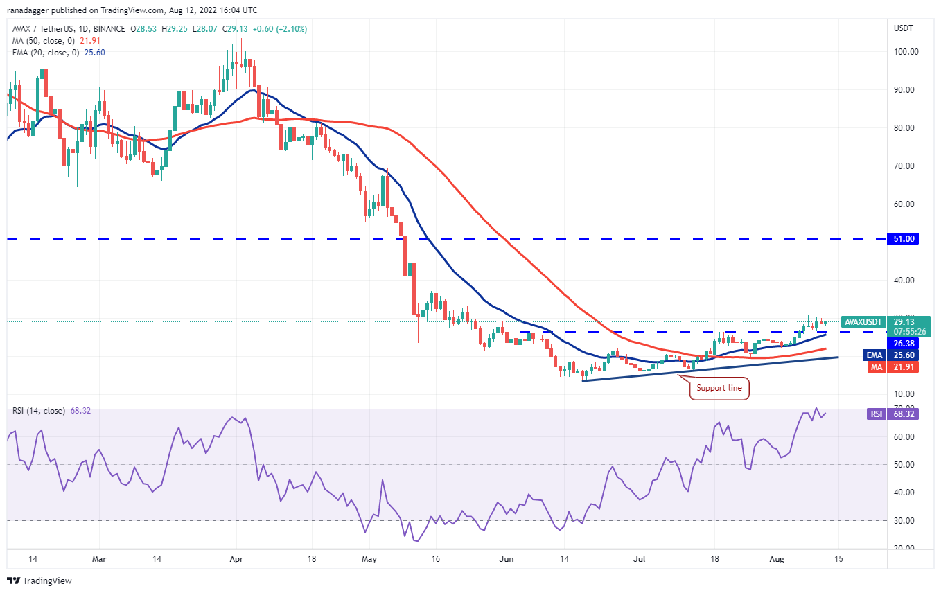 逐渐上涨的 20 日均线(25.6 美元)和超买区域附近的 RSI 表明对买家有利。如果多头将价格推高至 31 美元以上,则 AVAX/USDT 货币对可能会回升势头并反弹至 33 美元,然后再升至 39.05 美元的模式目标。