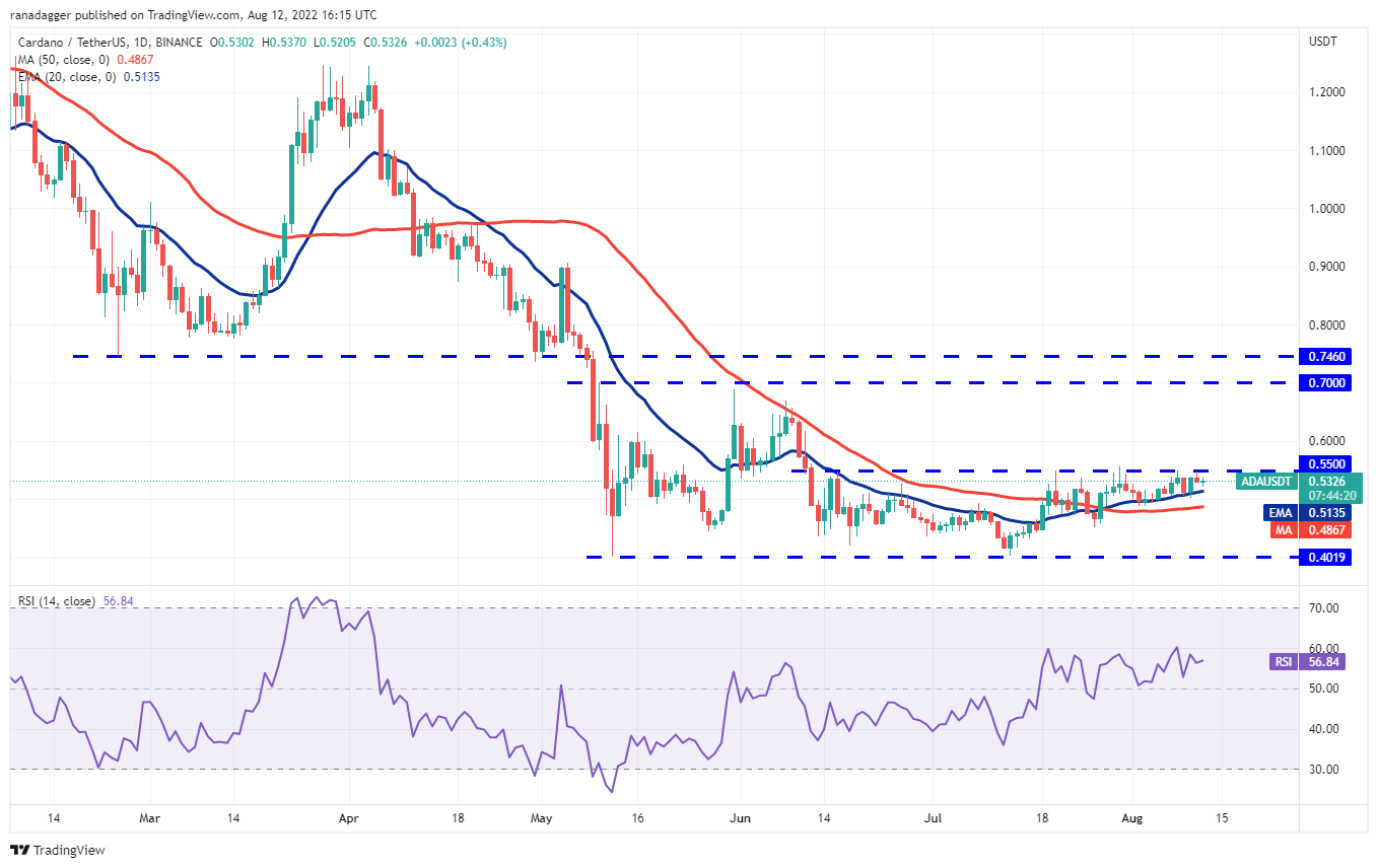 买家试图在 8 月 11 日将卡尔达诺 ( ADA ) 推高至上方阻力位 0.55 美元,但空头成功守住了该水平。价格现在可能跌至 20 天均线(0.51 美元)。