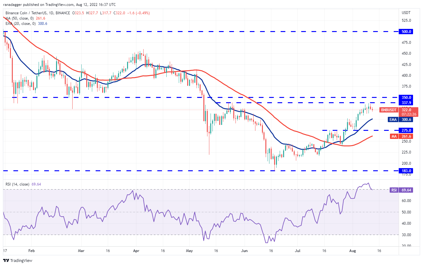 币安币 ( BNB ) 在 338 美元至 350 美元的上方阻力区一直面临强劲阻力。尽管空头一再阻挠多头清除这一障碍的尝试,但买家并没有放弃太多的阵地。这表明多头不会急于退出,因为他们预计会走高。