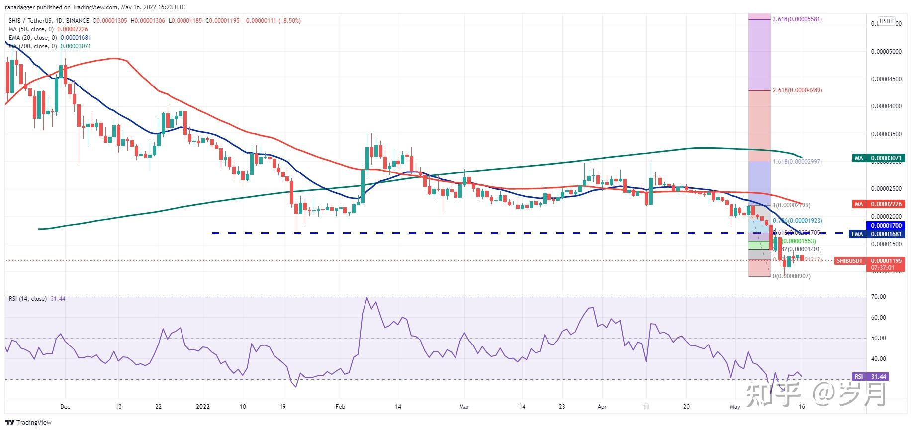 SHIB/USDTShiba Inu ( SHIB ) 的反弹在 5 月 13 日和 14 日触及 38.2% 斐波那契回撤位 0.000014 美元,表明空头不想放弃他们的优势。