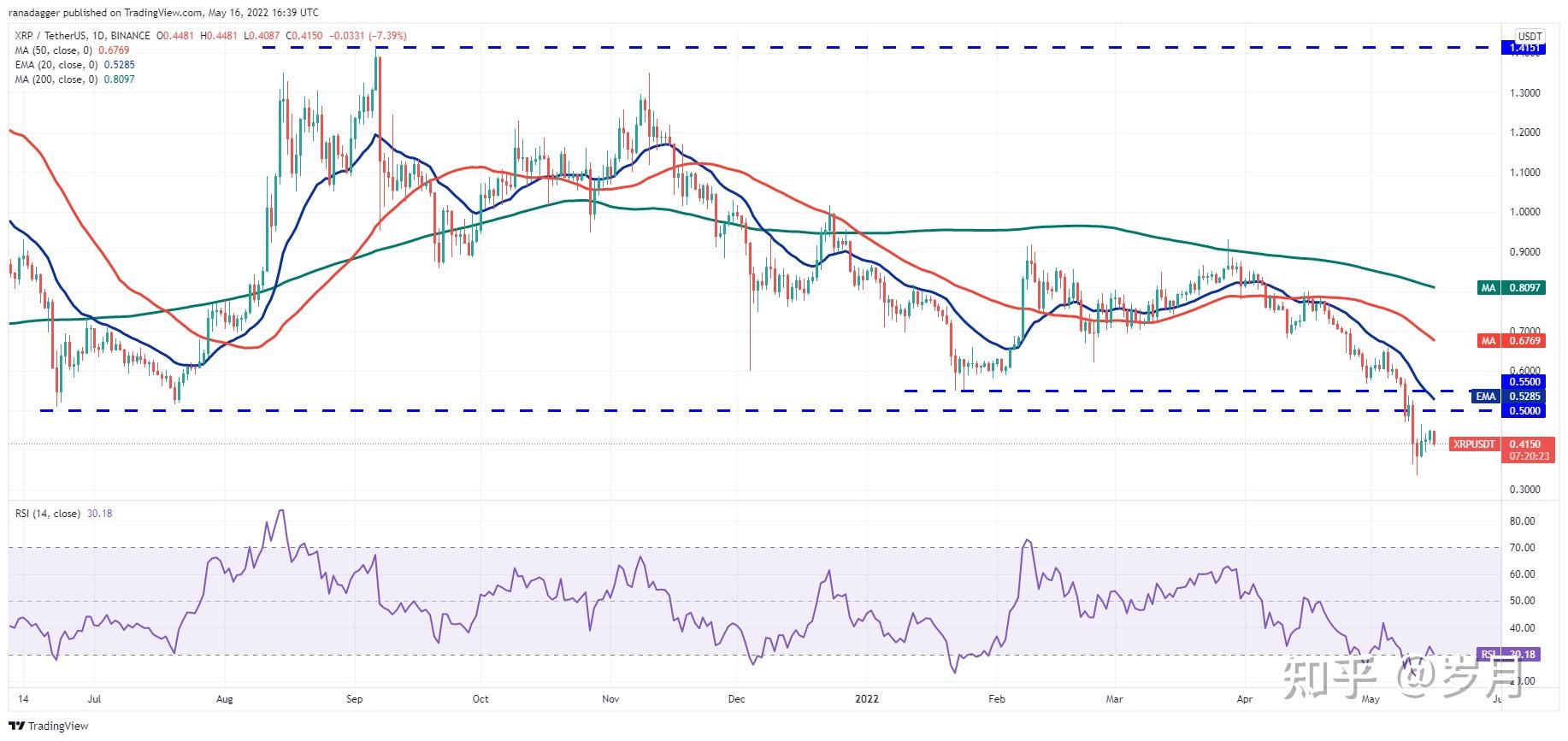 瑞波币/USDTRipple ( XRP ) 5 月 13 日烛台上的长灯芯表明空头正试图在 0.50 美元的击穿水平附近构成强大挑战。未能突破这种上方阻力可能会诱使短期交易者预定利润。