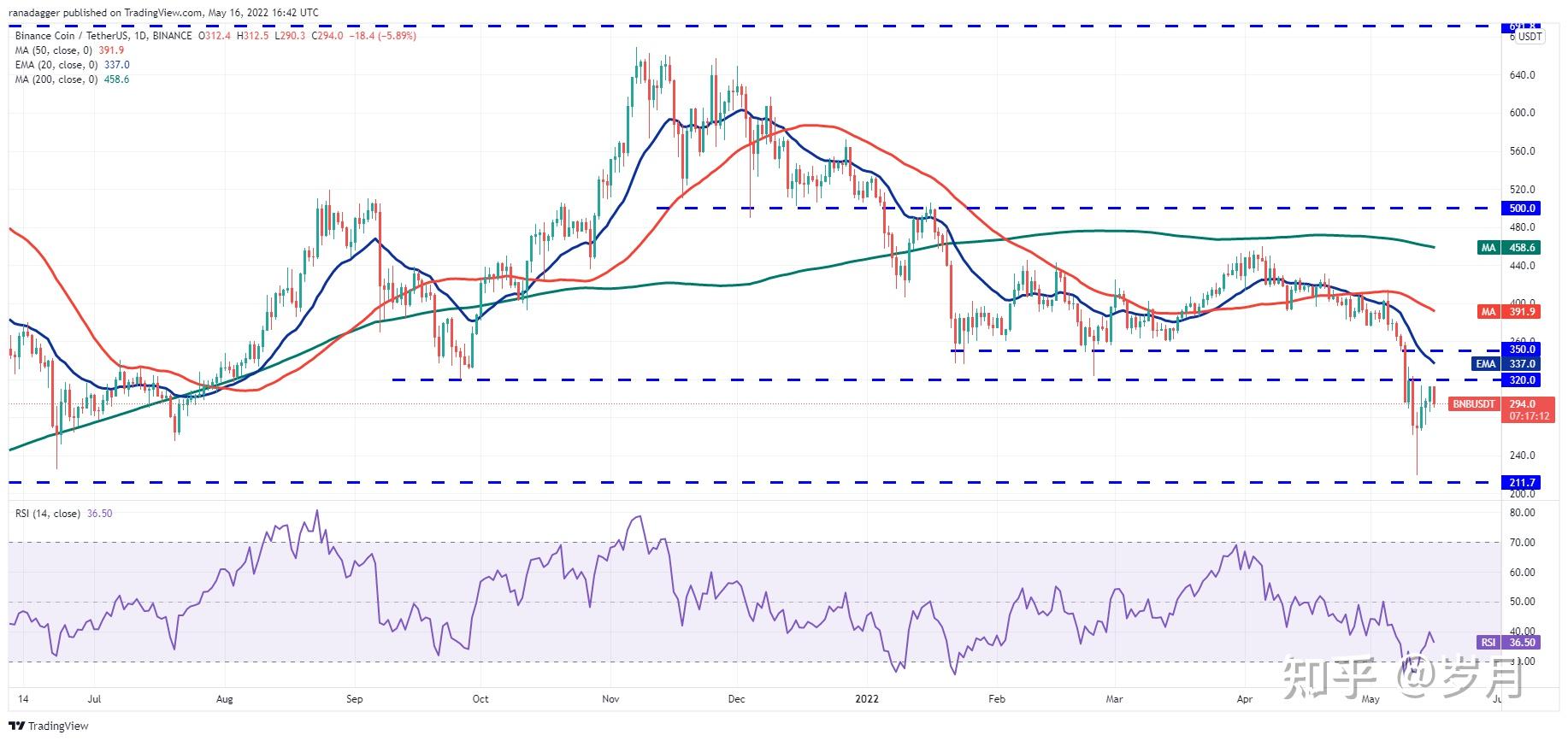 BNB/USDTBNB的强劲复苏在 5 月 13 日和 15 日达到了 320 美元的击穿水平附近,但多头无法清除这一头顶障碍。这表明空头正试图将水平转变为阻力位。