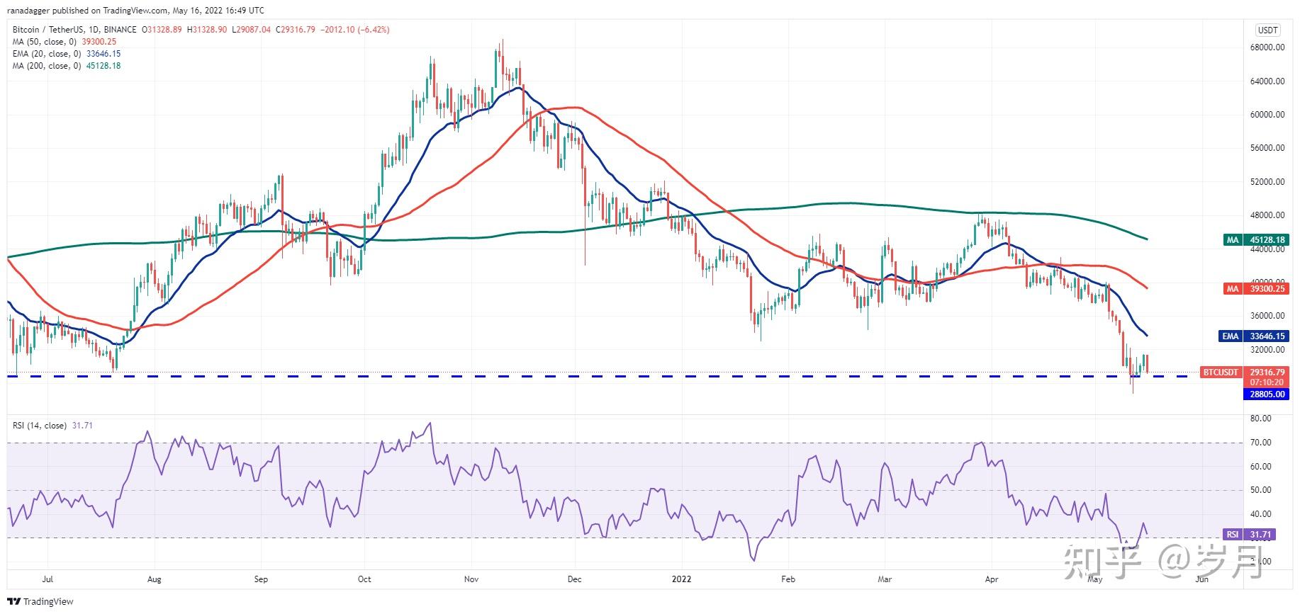 如果价格从 28,805 美元反弹,多头将再次尝试将 BTC/USDT 货币对推高至 20 天指数移动平均线(EMA)(33,646 美元)。这是一个值得关注的重要水平,因为突破并收于该水平之上可能表明多头正试图卷土重来。然后该货币对可能升至 50 天简单移动平均线 (SMA) (39,300 美元)。与此假设相反,如果价格跌破 28,805 美元,则该货币对可能跌至 26,700 美元。如果该支撑位破裂,该货币对可能会恢复下跌趋势,价格可能会暴跌至 25,000 美元,随后跌至 21,800 美元。